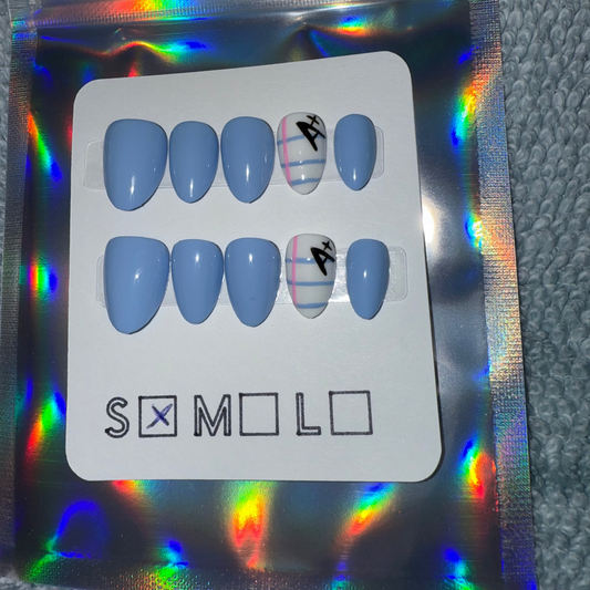 Light Blue Press-On Nails with Notebook Paper & A+ Accent – Extra Short Almond Shape