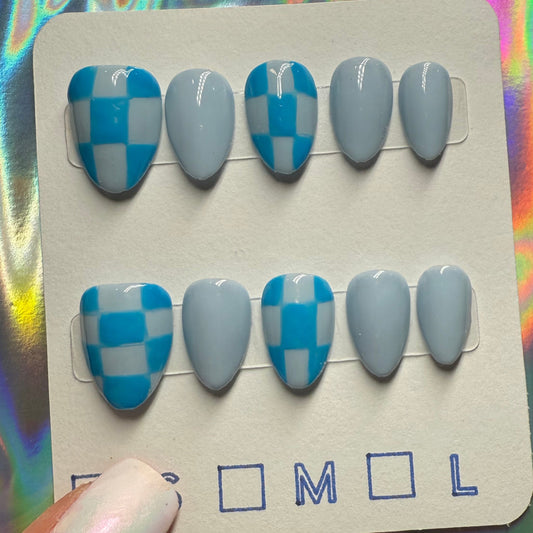 Blue Check Bliss Light Blue Checkerboard Press-On Nails | Extra Short Almond Size Small