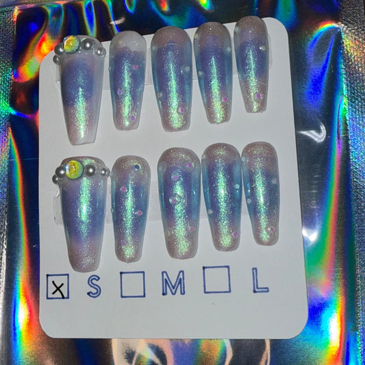 Celestial Glow Blue Aura & Gem Press-On Nails | Long Coffin Size Small