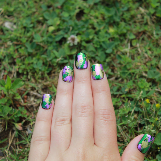 Mardi Gras Magic Gold, Green & Purple Foil Press-On Nails | Extra Short Square Size Small