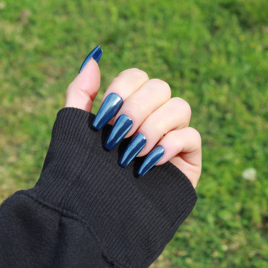 Midnight Chrome Navy Blue Chrome Press-On Nails | Medium Coffin Size Small