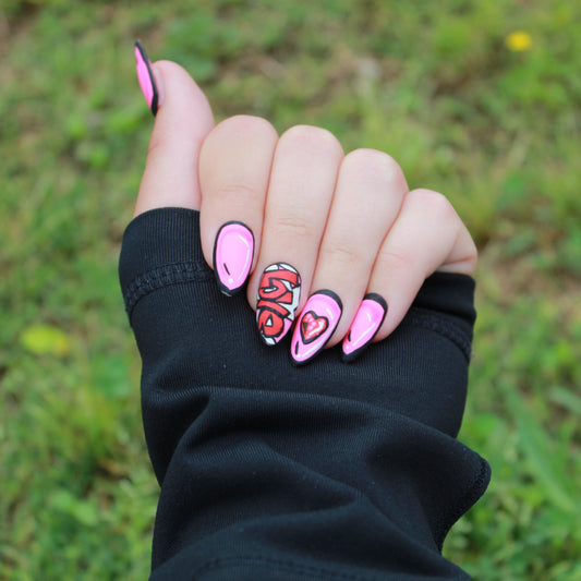 "Pop Art Love" Matte Pink Press-On Nails with "LOVE" & Heart Accents | Medium Almond Size Small