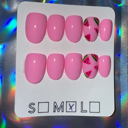 Bright Pink Watermelon Slice Short Round/Oval Press-On Nails – Reusable Gel X Set