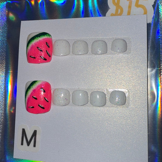 Frosted Melon White Glitter & Watermelon Press-On Toenails | Medium