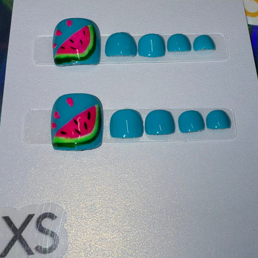 Tropical Pop Tiffany Blue Press-On Toenails with Watermelon Accent | Size Extra Small