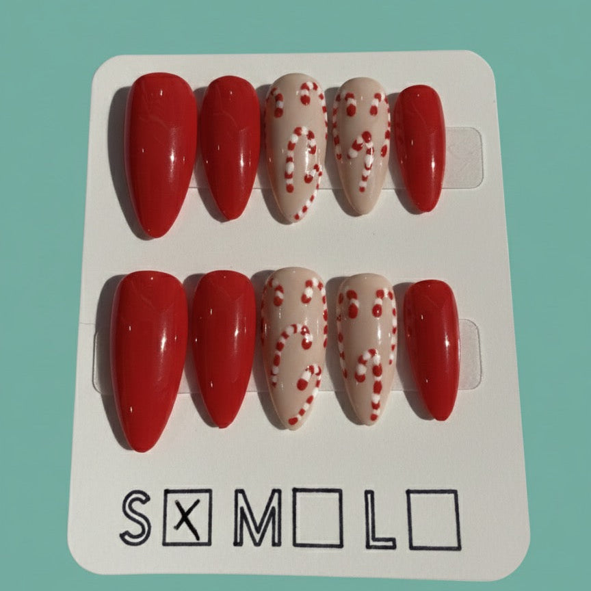 Get into the holiday spirit with our Hand-Painted Red & Nude Candy Cane Press-On Nails, featuring a classic bright red on the thumb, index, and pinky fingers, paired with a subtle nude base and sweet, hand-painted candy cane accents on the middle and ring fingers. Perfect for Christmas parties or adding seasonal cheer to your daily look, this set balances bold color with delicate holiday art. The Medium Almond Shape is elegant and elongating, making this set ideal for winter events while keeping the festive design front and center.