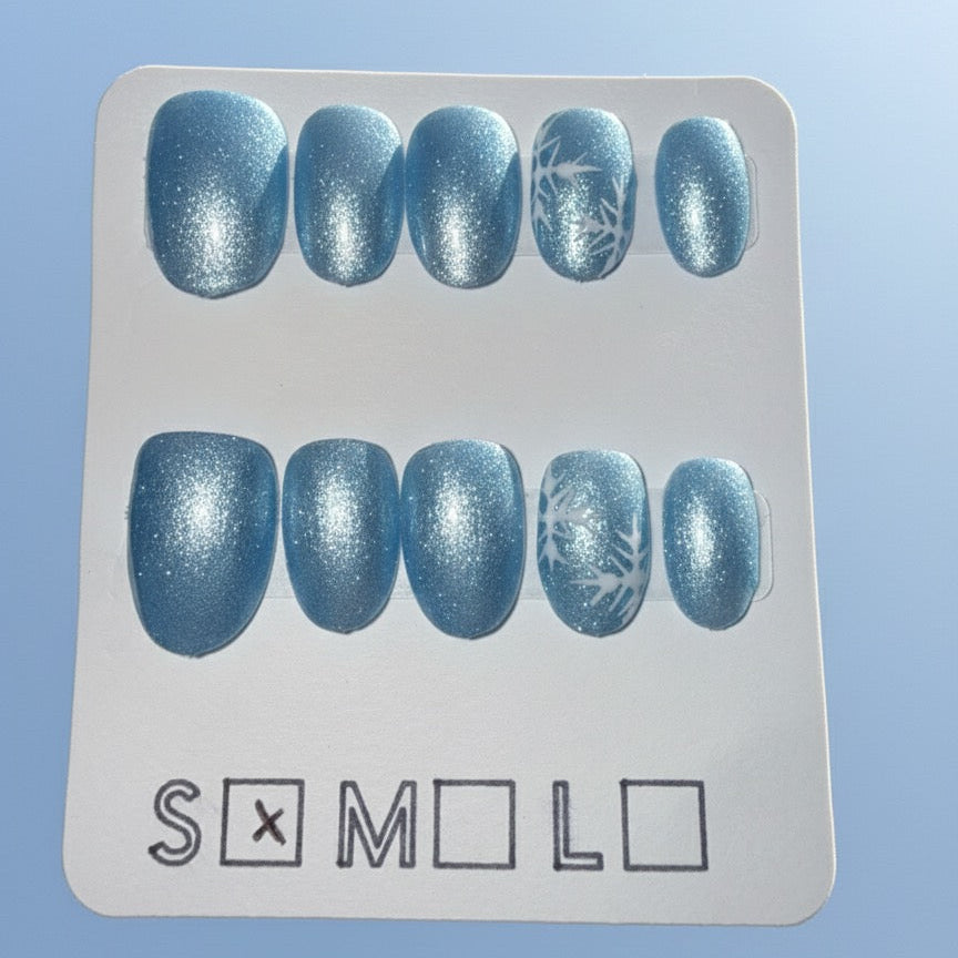 ✨ Key Features: ❄️ Hand-Painted Snowflakes: delicately painted white snowflakes on the ring finger for a unique, artistic touch. ✨ Icy Blue Shimmer: A gorgeous, light blue glitter finish that catches the light like frost. 💅 Short Round Shape: A natural, low-maintenance shape that is comfortable and durable for daily activities.