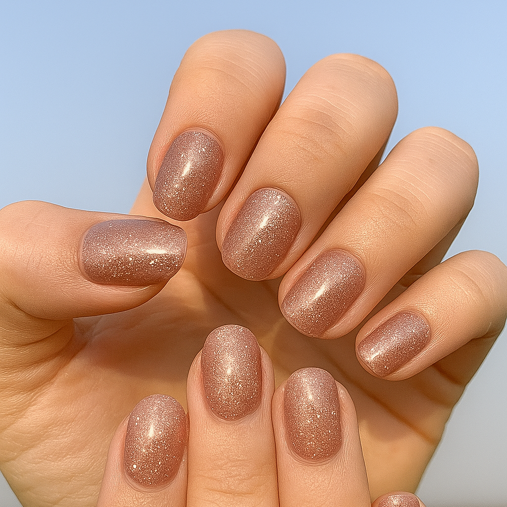 Capture the warm, mesmerizing glow of a precious gemstone with our "Tiger's Eye" press-on nail set. This elegant design features a sophisticated neutral tan base, brought to life with a shimmering golden cat eye effect.